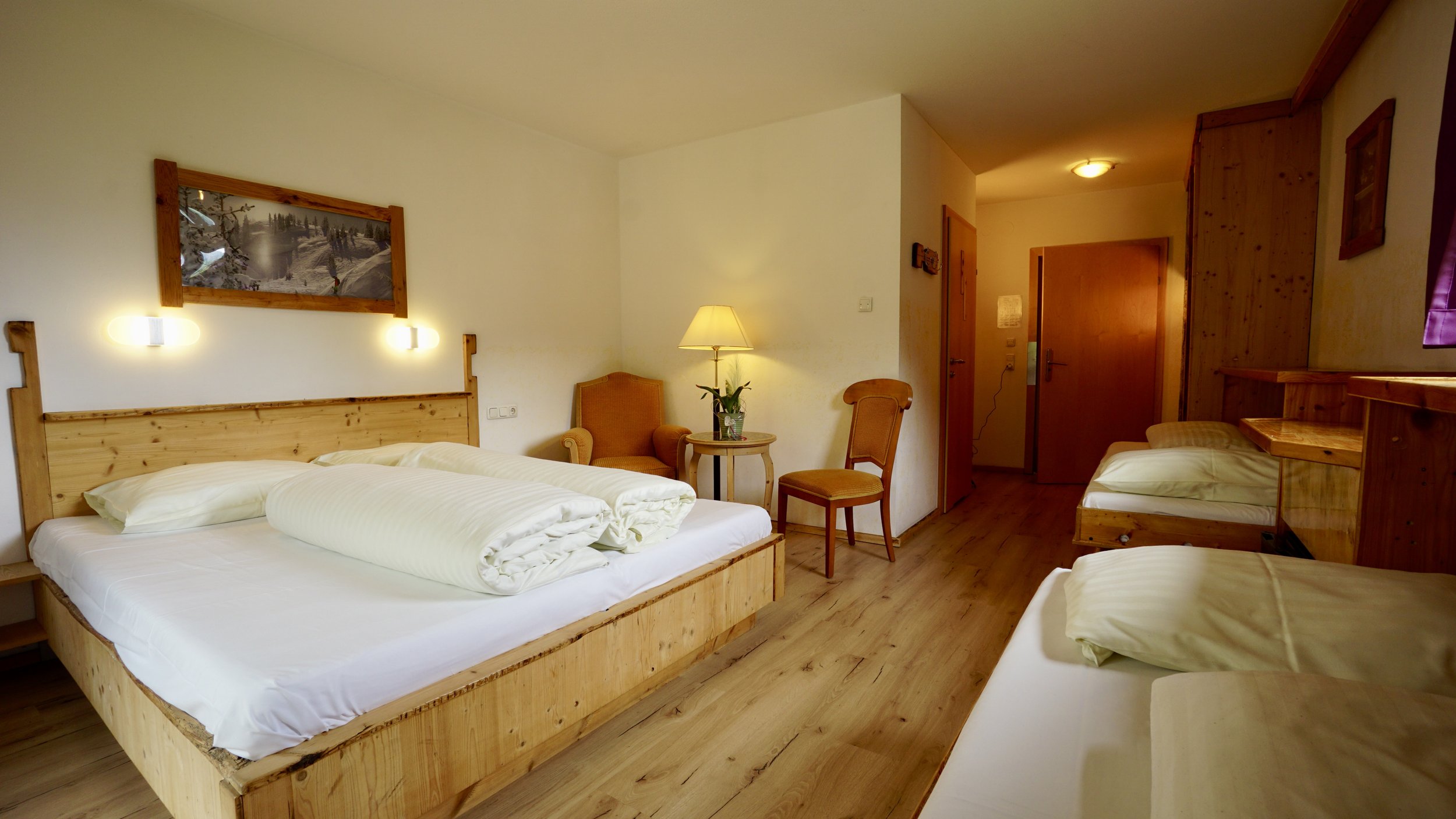 - Geräumige und stilvolle Einrichtung: Das Familienzimmer ist geschmackvoll eingerichtet, mit warmen Farbtönen und praktischen Möbeln, die einen einladenden Raum für die ganze Familie schaffen.
